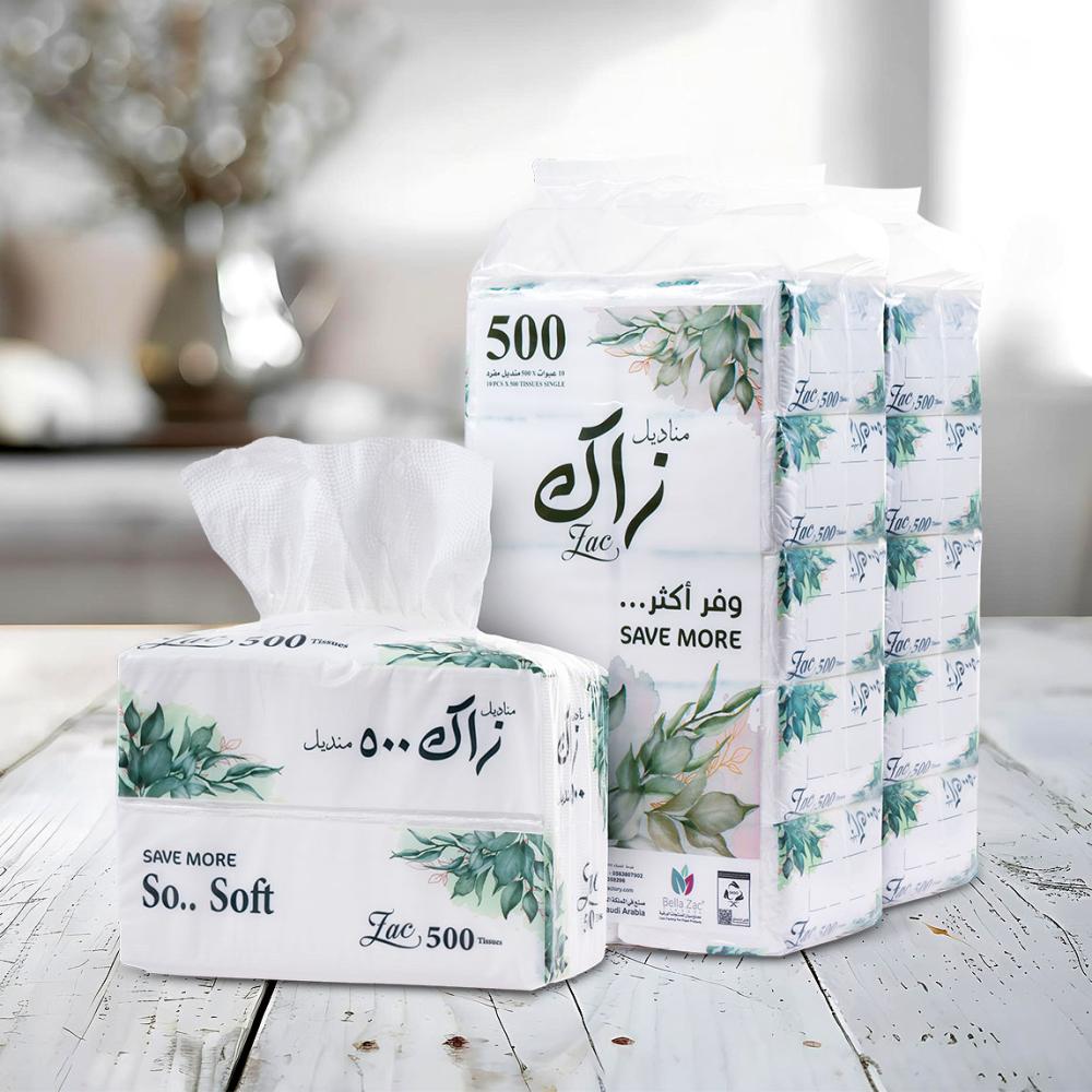 مناديل زاك 500، مناديل 3 طبقات تجمع بين الجودة والامتصاص العالي بحجم عملي 500 ورقة منديل، لتوفير نظافة فعّالة في المنزل والمكتب وأثناء السفر.