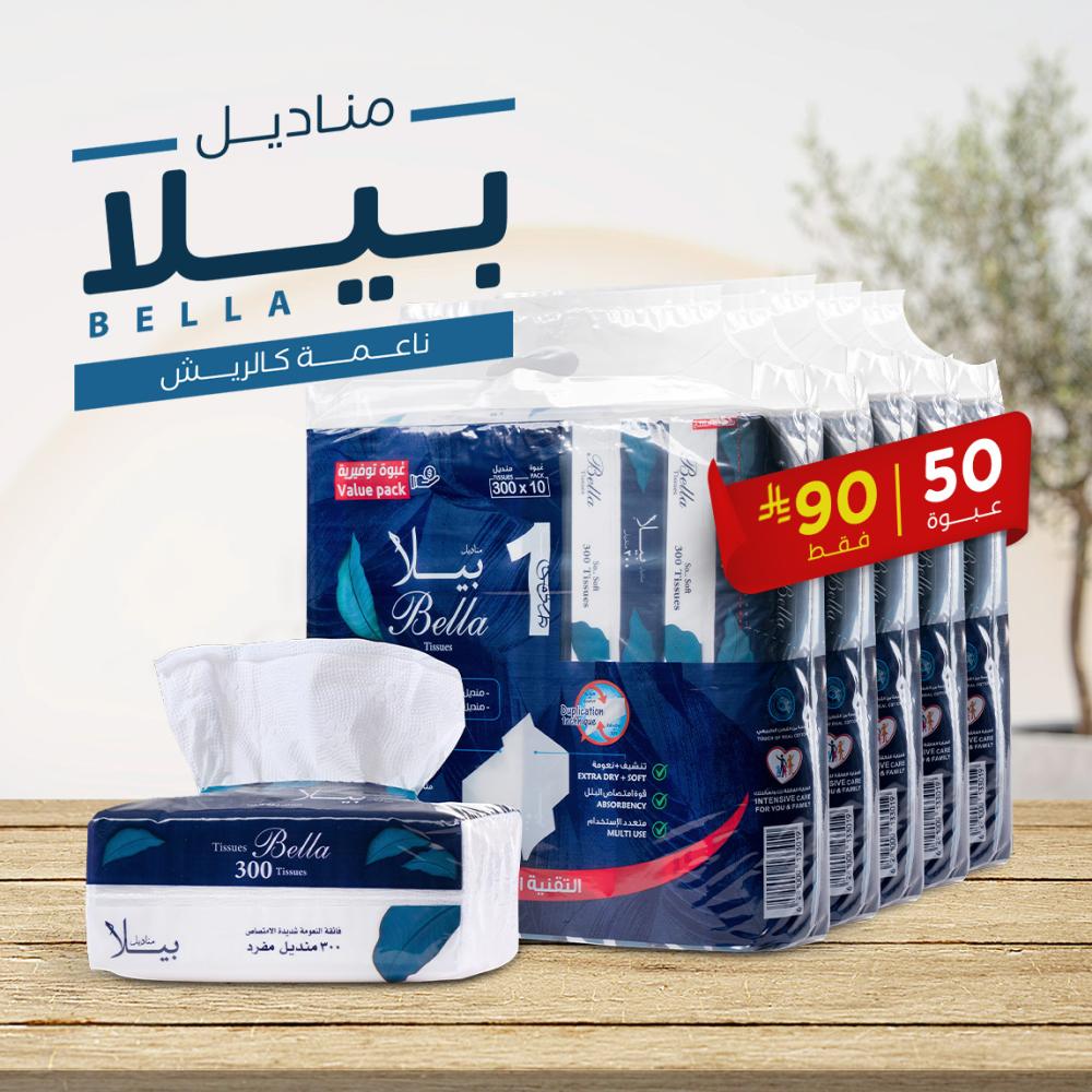 - إجمالي العبوات: 50 عبوة منديل بيلا 300.